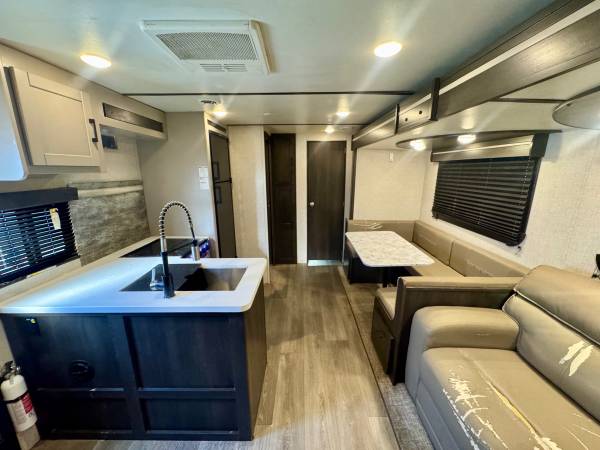 2022 cruiser aire by cross roads rv 33BHB 37ft travel trailer with 2 slide outs bunkhouse has large awning electric hitch electric leveling jacks outside kitchen ducted A/C and heat refrigerator and freezer stove oven has 2 bathrooms! Large glass shower walk around queen bedroom private bunkhouse with 4 bunks! Sleeps 10 comfortably in excellent condition in and out clean title for more info call 6025596579 no emails