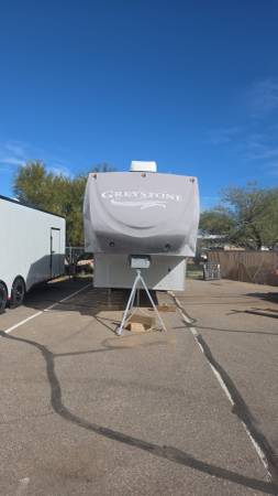 This a 2011 Greystone fifth wheel trailer by Heartland model 33QS it has four slides new furnace and hot water tank had components replaced and repaired .It has fireplace and 40 inch tv, 2 reclining...
