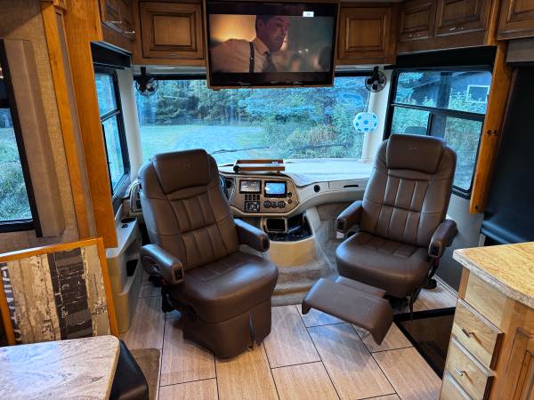 2 slides, 7000w generator, upgraded to recliners instead of pullout couch. King size bed, residential fridge, fireplace, 4 TVs. Full inspection at 40,000 miles, Transferrable warranty, Blue Ox towing system setup