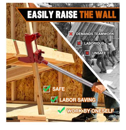 2.Work Alone – Allows a single person to safely raise a fully sheathed wall by the wall jack, lifting a wall with no help; NOTE: Do not stand under the wall when working; For large walls, two wall jacks are recommended in use.