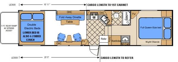 The exterior of the WEEKEND WARRIOR 36ft Toy Hauler is streamlined and aerodynamic, making it easy to tow on the road. 4 (6volt) batteries, 200w solar on roof, 2000w inverter/charger. 150-gallon fresh water, 50-gal grey and 50-gal black capacity. Auto slider hitch included! Power awning with wind sensors and the ramp makes a great patio. Contact us for more information and pictures please!