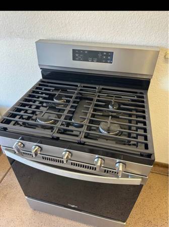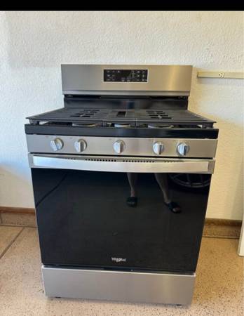Whirlpool stainless steel gas range, standard 30” wide. Oven has never been used, and the stovetop was only used a few times. Purchased for a home sale and later replaced with a wider model. In great condition and works perfectly.