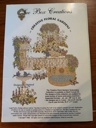Sue Box Creations Multi Format CD- ART, PES (2 sizes), SEW, JEG, HUS (2 sizes), PCS, VIP. This is a set and I will not separate. One has been used and the other is brand new.