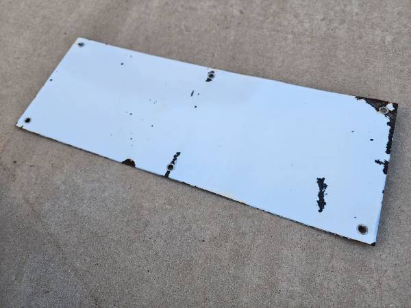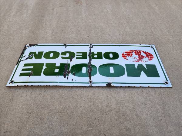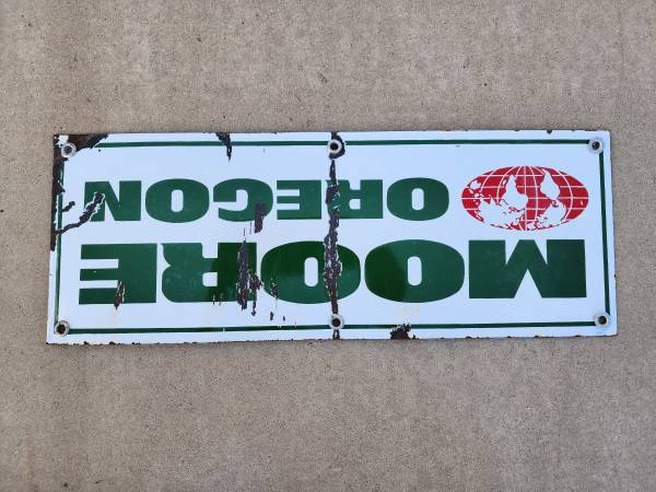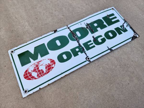 This is a vintage Moore Oregon porcelain enamel sign. Measures 18" x 6-5/8" Has some scuffs, scrapes and chips. Great wall hanger in the garage, on the fence, in the mancave or shed. $95 picked up...