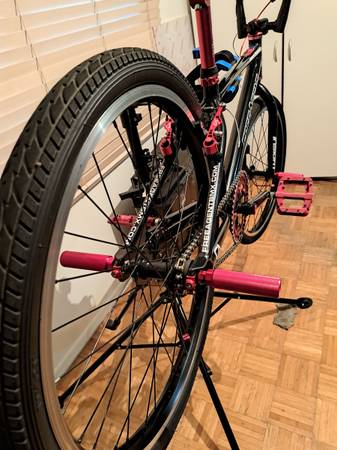 Like new. This is my pride and joy. My truck got totaled so need all the money I can get to buy new one. No payments. Freeagent ambush24 frame. Insight chromoly forks. 4 piece weeras aluminum handle bars. Old new stock black ops chromoly cranks. 2 piece aluminum Chain ring. 13 tooth odyssey freewheel. Black and gold Japanese IZumi chain. Double wall wheel masters rims. And lots of red bling.. and quality after market parts. Also comes with color matching handle bar bag and under seat pouch. Just added cool skull grips and much better chain tensioners