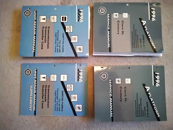 Pics 5 to 8, General Motors 4 volume set of factory service manuals. 1996 A Platform GMP/96-A-1 Book 1 of 2 and GMP / 96-A-2 and GMPT Factory Service Manual set for A Platform GM cars, includes Cutlass Ciera, and Buick Century. Very Thick Service Manuals. This book contains all sections Including Drivability and Emissions (Sections 6E and 6E3), Automatic Transaxle Diagnosis (7A-5A), and Electrical Diagnosis (Section 8A). This book specifically contains Section 0 - General Information, Section 1 - Heating and Air Conditioning, Section 3 - Steering, Suspension, Tires and Wheels, Section 4 - Drive Axle, Section 5 - Brakes, Section 6 - Engine, Section 7 - Transaxle, Section 8 - Electrical - Body and Chassis, Section 9 - Accessories, Section 10 - Body Service and the Index. Included is GMPT/96-TURM and GMPT/96-TURM-S covering Both Automatic and Manual Transmission, Transaxles and Transfer case for all GM Passenger Cars and Light Duty Trucks. These are Service Manuals GM Dealer Service Professional's Use. Using This Manual Can Save You Hundreds of Dollars in Costly Repairs. All Specs and Procedure Are Outlined with Pictures and Easy to Understand Directions. Everything You Need to Know to Complete the Repairs Needed on Your GM Vehicle. Each manual Measures 8 1/2 Inches by 11 inches, all the manuals total to about 5 inches thick.