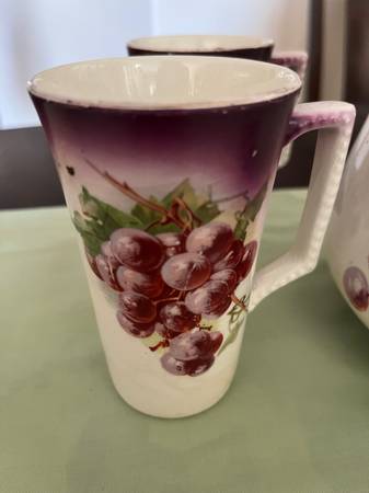 rare vintage beautiful Dresden china lemonade/cider pitcher with 4 cups; painted on porcelain/ceramic purple grapes with gold rims