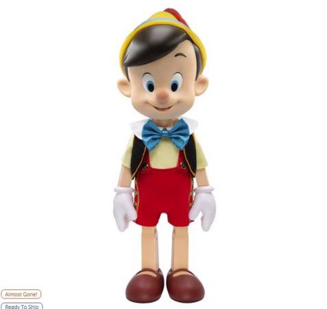 The Disney’s Pinocchio Supersize premium vinyl figure pays homage to the classic Walt Disney animated film. This 16” designer figure is fully poseable, featuring premium vinyl construction and real cloth apparel, including a satin bow, cotton collar, satin-trimmed vest, soft yellow shirt, brass-buttoned suspenders, and beautifully embroidered shorts. The Supersize Pinocchio vinyl figure serves as a reminder to always let our conscience be our guide- and maybe this is one temptation worth giving into!
