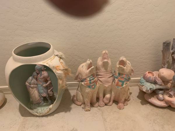 Floor Lamp. Sold Vases. $25.00 each House $20.00 Woman cooking $35.00 Vase & moccasin. $25.00 Vase Chief/woman $25.00 Dogs. $15.00 Woman $45.00 Man & Eagles. $50.00 Buckeye,Az 85326