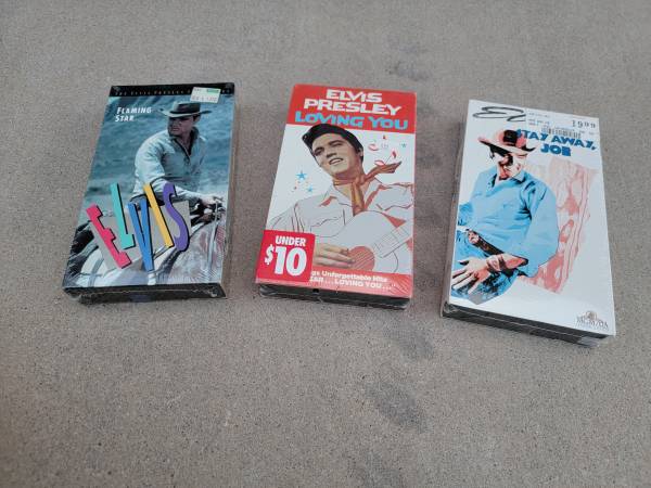 3 Vintage ELVIS PRESLEY Factory Sealed Video Tapes VHS. All 3 have never been opened and look great!! There is Flaming Star, Loving You and Stay Away Joe (which was filmed here in AZ). $20 for all 3...