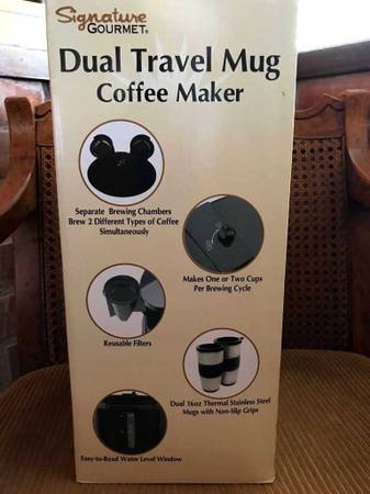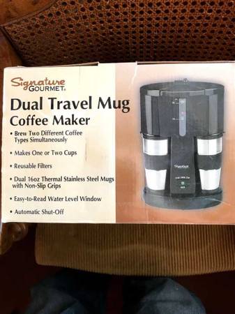 Signature Gourmet.....Never out of the original box. Dual Travel Mug Coffee maker - Stainless steal 16 oz mugs. Reusable filters Automatic shut off. Firm