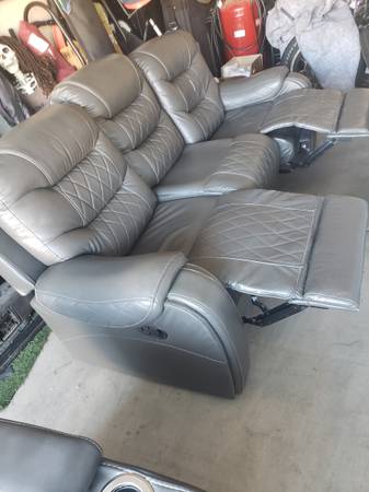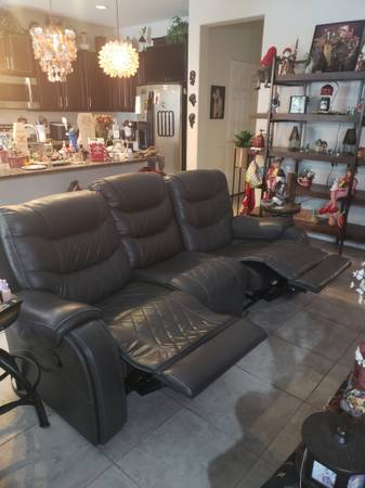 Light brown couch, 3 seater, both ends manualy recline. 3rd seperate electric recliner doesn't open.