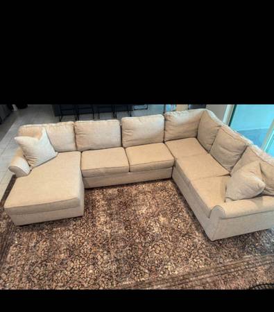 Comfortable beige sectional sofa with chaise lounge in excellent condition. Regularly steam-cleaned and well maintained. Pet-free and smoke-free home. Measures 120” x 115”.