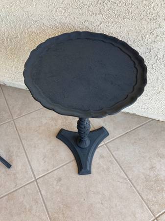 Vintage plastic end table. Made in Italy. Painted black. Pedestal table 14" diameter, 22" tall. Please call or text Mavis 6 0 two 6 two 2 three seven 6 2 for information.