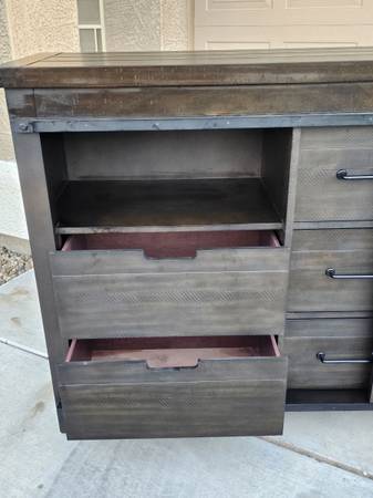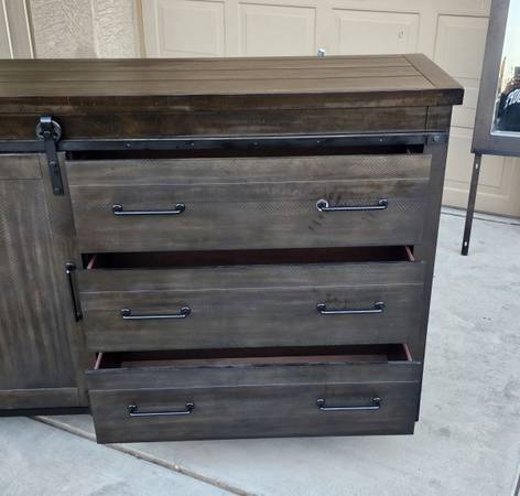 Storage is a piece of cake with my rustic Montana Dresser! Constructed of pine solids and veneers, this dresser has tons of storage space. There are three drawers visible at first glance- just move the sliding door and two more are revealed! Finally, the stylish hardware completes the look. Now you can have the best for less with this charming bedroom piece. It's in brand new condition. Matching media console available for an additional fee.