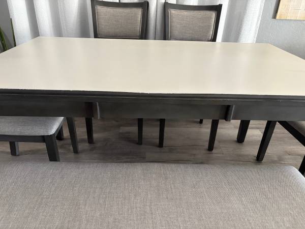 For sale beautiful wood gray/cream table, 4 chairs and breakfast bench. Counter height length 59 inches height 30 inches. Excellent condition Text if interested