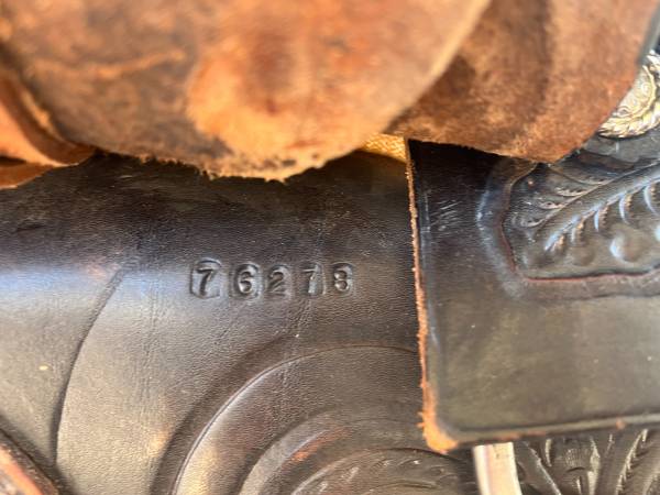 Western saddle with a 15-1/2” padded, rough-out seat, silver conchos and accents. It is marked “hand Made by Carl Sanders” Circle A with a serial number 76278. It is in very good condition, cleaned and ready to go. Includes back cinch and rope front cinch as shown in photos.