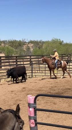 Previous owners had purchased him for Barrels, he was familiar with the pattern when we acquired him. We have used him for trails, camping and introduced him to Ranch sorting through practice clinics. He was comfortable with cattle after a few sessions.