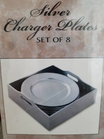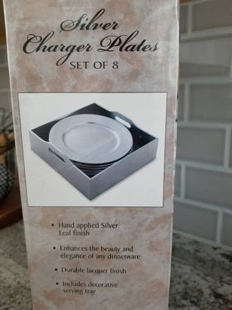 New-in-Box | Lacquered Silver-Leaf Finish Charger Plates 13" | Set of 8 | with Handled Serving Tray. - Hand-Applied Silver Leaf Finish - Durable Lacquer Finish - Includes Decorative Serving Tray...