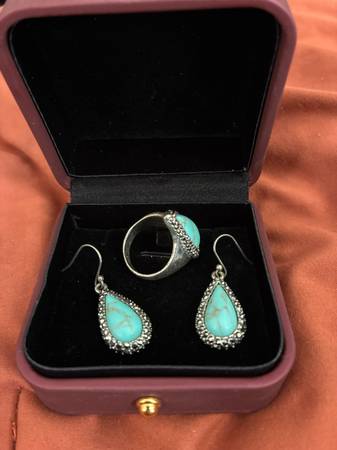 Discover this perfect blend of elegance and versatility with this exquisite ladies turquoise ring, and earrings to match. The ring is in a size ladies seven. Each piece is crafted with meticulous attention to detail. This is best for casual outings to a night on the town. This collection makes a thoughtful gift for loved ones or a delightful treat for yourself. Don’t miss the chance to add these treasures to your jewelry collection.