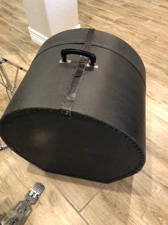 - (2) Vintage bass drum hardshell travel cases, black, carry handles, and leather belt straps. 18x25 inches.
