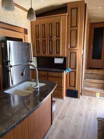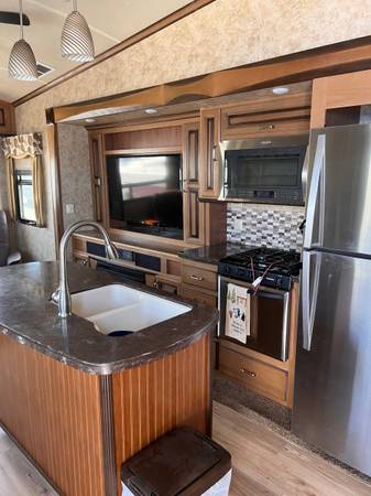 2106 Cedar Creek by Hathaway (Forest River) 5th Wheel for sale. This is a Model 34RL which is 36’8’ long with 2 axles. Interior has a queen bed, washer.dryer combination 2 TVs, electric fireplace, sofa bed, dinette, residential refrigerator and an island sink in the kitchen. There are 3 slide outs, 2 in the living room/kitchen area and one in the bedroom.