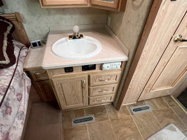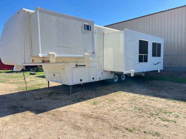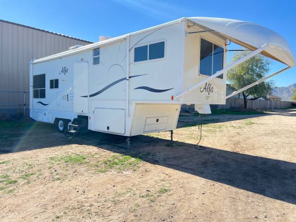 2005 Alpha fifth wheel what two slide outs Ac roll out awning on board generator three propane tanks good tires, electric jacks outside shower outside storage stand-up shower, walk around queen size bed, couch and dinette what two captain swivel chairs 32 inch plasma TV double sink double door refrigerator three burner stove oven in microwave. RV is nice and clean must seem to appreciated many more options to list $8900 480-773-2448