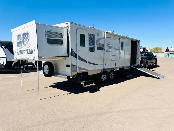 Selling my beautiful 2008 Homestead by StarCraft toy hauler 28 feet with private garage for a motorcycle sleep 8 In great condition condition in and out, everything works great has two slide outs this RV is equipped with oven fridge microwave for burner stove, full size bathroom and shower queen size bed, dinette table and couch. Central AC and heat One owner non-smoker very well. Taken care of new tires for more info. 480-851-1095