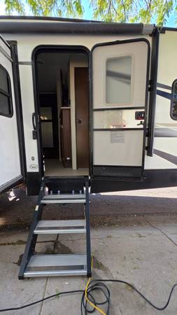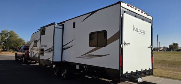 Forest River Wildcat 30th 2019 Toy Hauler, it has 3 TVs, (2) 30lb Propane tanks with gauges, 125Ah LiFePO4 Lithium Battery, full kitchen with 3 burners, microwave, gas/electric refrigerator/freezer, toilet and shower tub, front power jack, leather recliner twin sofa, pre wired for cable or satellite, pre wired for solar charge with panel ready, Awning, exterior and interior speakers, 20 Gallons Fuel station, no generator but there's a hook up for it, 2 slide outs, dry weight 7600, the main bed is queen size and the garage it's separated it has its own door out and also one to the kitchen with queen bed that turns to 2 seats (measurements 121 inch long by 92 inch wide and 73 inch between the sofas that would fit a side by side or quads), I'm also including the stabilizer tow hitch, has everything you need, I'm asking $22,500 or best reasonable offer, serious buyers please