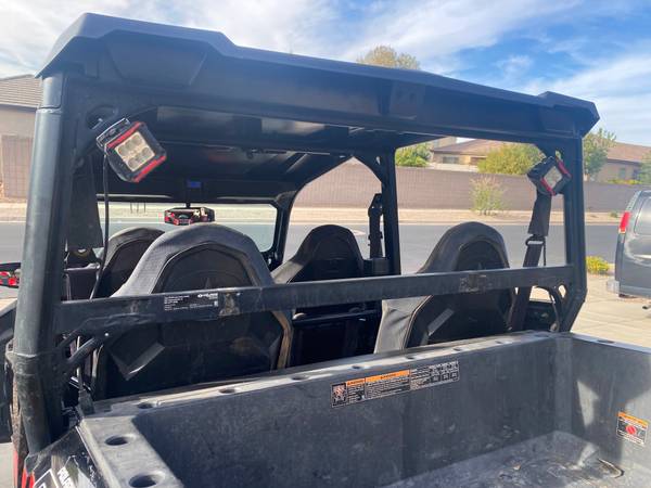 40" Athena curved light bar, cube lights front and back, HD rims, 30" Motovator tires, unused full size spare tire and Custom made foldable spare tire rack. The machine has been well cared for, garage kept and never at The Dunes. It does have some scratches on the sides. Everything in good working order and title in hand.