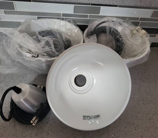 3 brushed nickel hanging light fixtures. 8" diameter. Brand new.