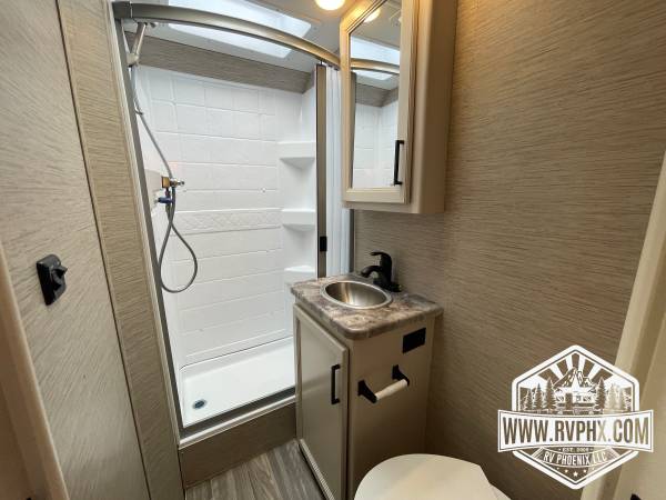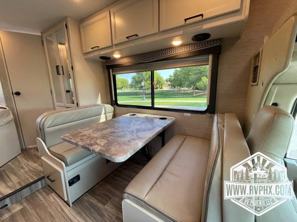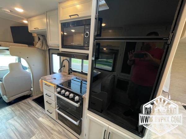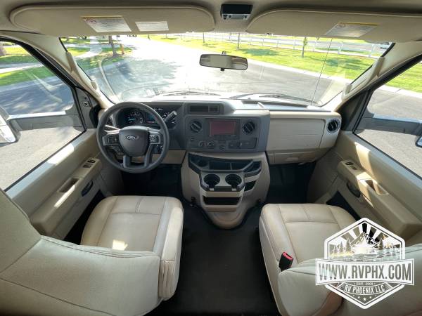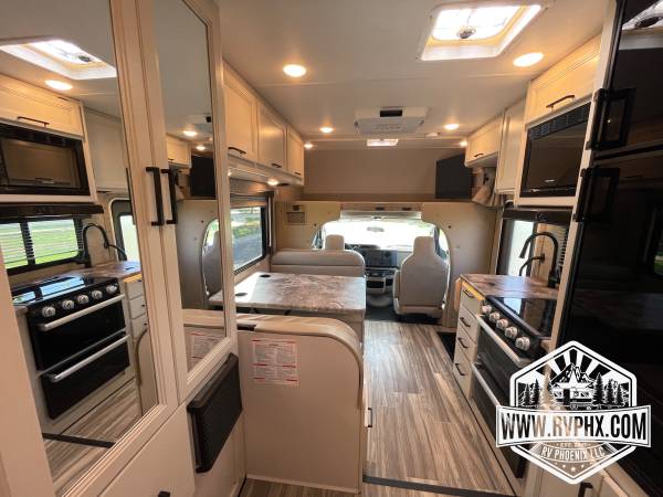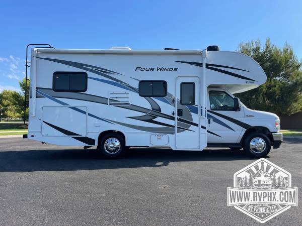 The Four Winds 22E is a compact 22-foot class C luxury model motorhome. The Thor 22E is the perfect motorhome for big or small trips! It has a full kitchen, full bathroom with a shower, refrigerator, freezer, and heater. This Class C Motorhome sleeps 5-6 people comfortably and has an over cab queen bed, rear queen bed, dinette, and dinette sleeper. It has several luxury features, including a large flat-screen TV and side camera mirrors for easier driving! This recreational vehicle has room to accommodate the whole family and a few friends. If you are looking for pure luxury, this is the RV for you! **********************************************************************************************************************