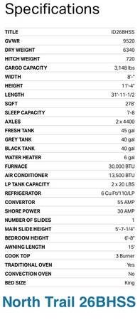 The 26BHSS North TrailUltra Lite is perfect for any type of trip! It has a full kitchen, full bathroom with shower, refrigerator, heater, and a great stereo system. This trailer sleeps 8+ people very comfortably and has tons of beds! The trailer has bunk beds, a dinette sleeper, a sofa sleeper, and a queen front bedroom. This trailer is lite weight and can even be towed by a standard 1500 truck like a Chevy Silverado or Ford F150. **********************************************************************************************************************
